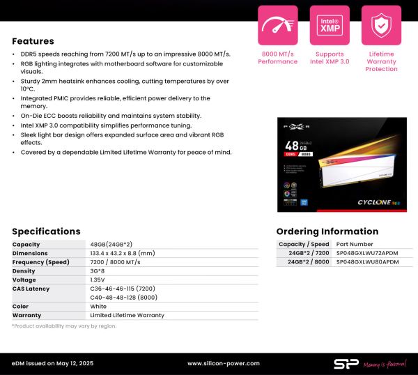 Silicon Power представила новую память DDR5 в рамках своей игровой серии XPOWER Cyclone: XPOWER Cyclone DDR5 RGB CUDIMM и XPOWER Cyclone DDR5 RGB UDIMM.